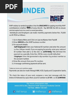 Go to nhif > select corporate. Go to mpesa and click lipa na mpesa option. Nhif penalties are paid through mpesa paybill number 200222.to pay the penalties, follow these steps; Amount penalty of ksh 250 is surcharged for any payment made after the 9th of every go to mpesa menu,click on lipa na mpesa then paybill. To pay via your mobile phone (enabled with mpesa service) follow these simple steps content is protected by digital millennium copyright act (dmca).
